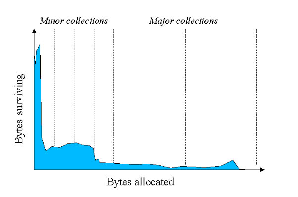 Java 프로그램이 진행됨에 따라 GC에 의해서 시간이 지날수록 메모리가 할당되어 있는 객체들은 적어집니다. 이를 통해서 대부분의 객체들은 수명이 짧다는 것을 알 수 있습니다. 이러한 GC과정을 더 최적화 하기 위해서 heap 메모리를 좀 더 세분화해서 관리하게 됩니다. 왼쪽 상단에 위치한 Minor collections는 Young영역에서 발생하고 오른쪽 상단에 위치한 Major collectios는 Old영역에서 발생합니다. 결과를 바탕으로 다시 처음으로 돌아가 이 알고리즘은 2가지를 전제로 만들어 졌습니다.