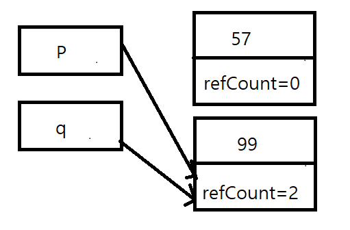 아래 사진은 처음 객체 p, q 가 생성되고 p=q; 로 q가 참조하는 인스턴스를 p도 참조하도록 했을 때의 메모리 그림입니다.