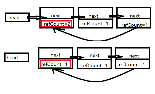 상단의 그림은 head가 맨 왼쪽의 첫 번째 item을 참조하여 refCount=1입니다. 그리고 맨 오른쪽에 있는 마지막 item이 맨 처음 item을 참조하기 때문에 1이 증가해 refCount=2이 됩니다.