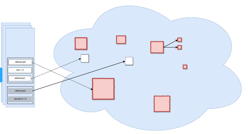 아래 그림에서 왼쪽 파란색 네모는 스택(stack) 영역이고, 오른쪽 파란색 구름은 힙(heap) 영역입니다. 스택의 클래스 참조변수가 힙 메모리에 있는 인스턴스를 참조하고 있는 그림입니다. 빨간색으로 표시된 네모 객체들은 가비지 컬렉터의 제거대상입니다.