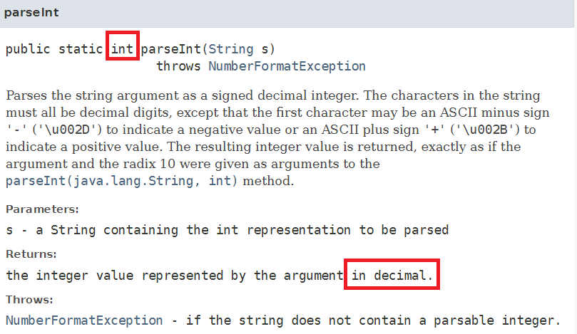 String 문자열을 매개변수로 return을 보면 in decimal이라 하여 int형이다. 즉, String -> int로 한번에 변환시킨다.