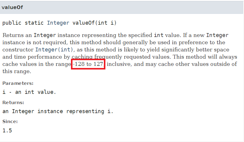 Integer.valueOf()는 int i의 값이 -128~127 사이에 있는지 확인하고 그 사이에 있는 값이 맞다면 바로 참조한다. 그렇지 않다면 새로운 객체를 생성하여 값을 만든다.
