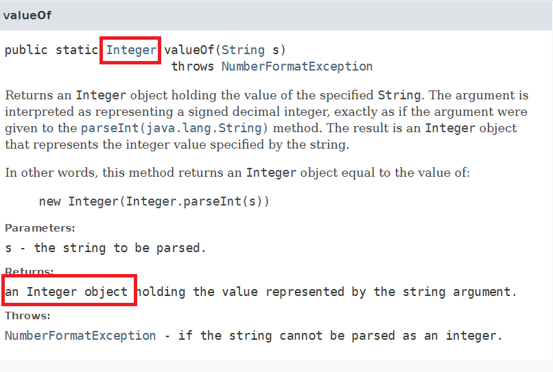 String 문자열을 매개변수로 return을 보면 Integer이다. new Integer(Integer.parseInt(s))라고 나와있다. 즉 이 메서드는 String형을 int형으로 변환하고 Integer형으로 박싱(Boxing)하는 것이다. 하지만 보통 우리는 Integer.valueOf()를 int형 변수로도 사용을 많이 하는대 자동언박싱(Auto-UnBoxing) 덕분이다. 하지만 String->Integer, Integer-> int의 2번의 변환 과정이 일어난다.