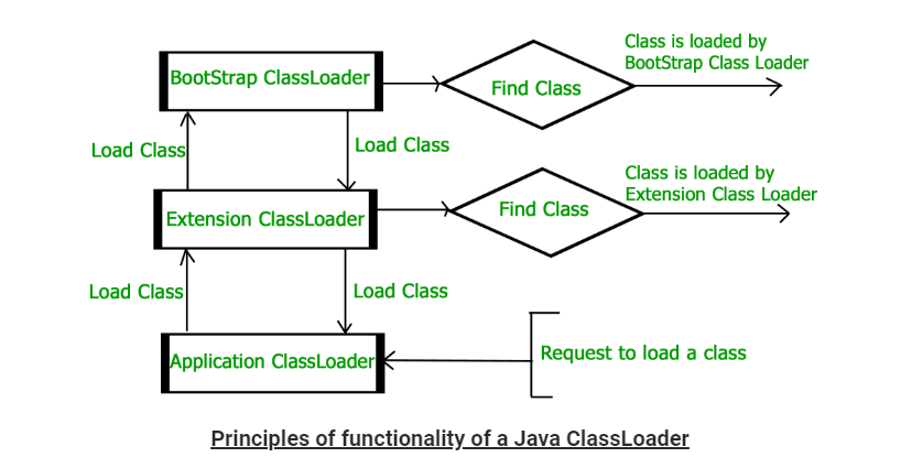 클래스 로더 시스템은 자바 클래스를 JVM의 Runtime Data Area에 동적으로 로드합니다. 컴파일 시점이 아닌 런타임 시점에 참조하고 있는 클래스를 로딩, 링킹, 초기화를 통해 로드합니다. 클래스 로더 덕분에 런타임에 파일 시스템이나 파일에 대해서 알 필요가 없습니다. 모든 클래스들이 단 하나의 클래스 로더로 로드되지 않습니다. 클래스들의 경로와 종류에 따라서 달라지며 getClassLoader() 메소드로 결정합니다. 적합한 클래스를 찾지 못하면 NoClassDefFoundError나 ClassNotFoundException을 던집니다.