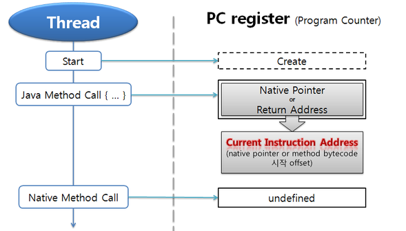 PC register는 현재 실행중인 명령어의 주소를 저장하는 곳입니다. 메서드를 실행하고 있다면 Native Pointer와 Return Address를 가지고 있으며 현재의 명령어 주소를 가지고 있습니다. 수행중인 쓰레드가 Native Method이면 undefined 상태로 아무 값도 할당되지 않게 된다.