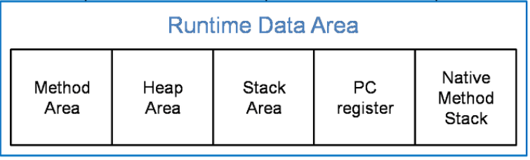 런타임 데이터 영역(Runtime Data Area)은 JVM의 메모리 영역으로 어플리케이션 실행을 위한 데이터들이 적재되어 있습니다. 아래 사진처럼 Method Area, Heap Area, Stack Area, PC register, Native Method Stack 5가지로 나뉩니다.
