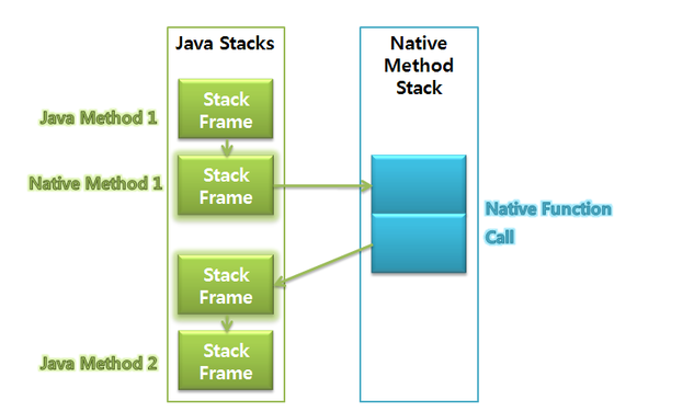 Native Method Stack은 Java 외의 언어로 작성된 프로그램으로 API 툴킷 등과 통합을 쉽게 하기 위해 JNI(Java Native Interface) 표준 규약을 제공하고 있습니다. 즉, 자바 프로그램에서 네이티브 코드로 되어 있는 함수를 호출 할 수도 있고 결과 값을 받아올 수도 있습니다. Native Method가 호출되면 현재 스택에서 나와 해당 쓰레드의 스택에서 작동을 하고 다시 본래의 스택으로 돌아갑니다.