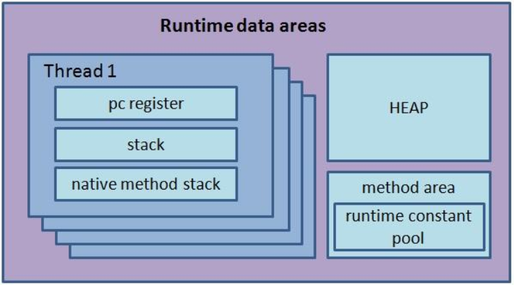 Stack, PC register, Native Method Stack는 각 쓰레드마다 하나씩 생성되기 때문에 아래의 그림처럼 여러개가 존재할 수도 있습니다.