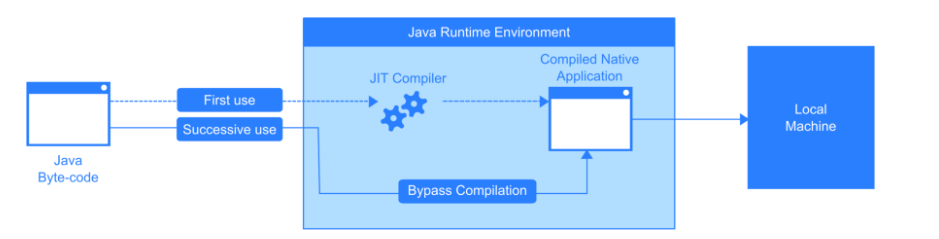 First use는 처음 본 코드에 대한 과정이며, JIT Compiler가 Byte-code를 컴파일하여 Native Code(사실상 Machine Code)로 바꾸고 Cache에 저장합니다. Cache의 위치는 JVM의 Method Area에 코드 캐시입니다.