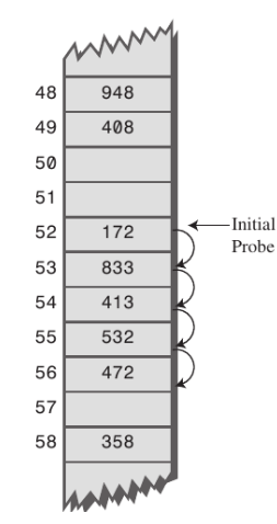 선형탐사(Linear Probing)는 최초 저장되는 공간에 값이 있으면 비어있는 공간이 나올 때까지 1씩 이동하여 탐색합니다. 하지만 primary clustering 문제가 발생하는데, 한 번 충돌하기 시작하면 해당 지역은 계속 충돌이 발생합니다. 위 사진에서 52번에서 충돌이 있어 53,54,55,56까지 이동하고 57까지 이동해서야 비로소 값을 할당합니다. 평균 검색시간이 너무 늘어나기 때문에 hash의 성능을 효율적으로 이용할 수 없습니다.