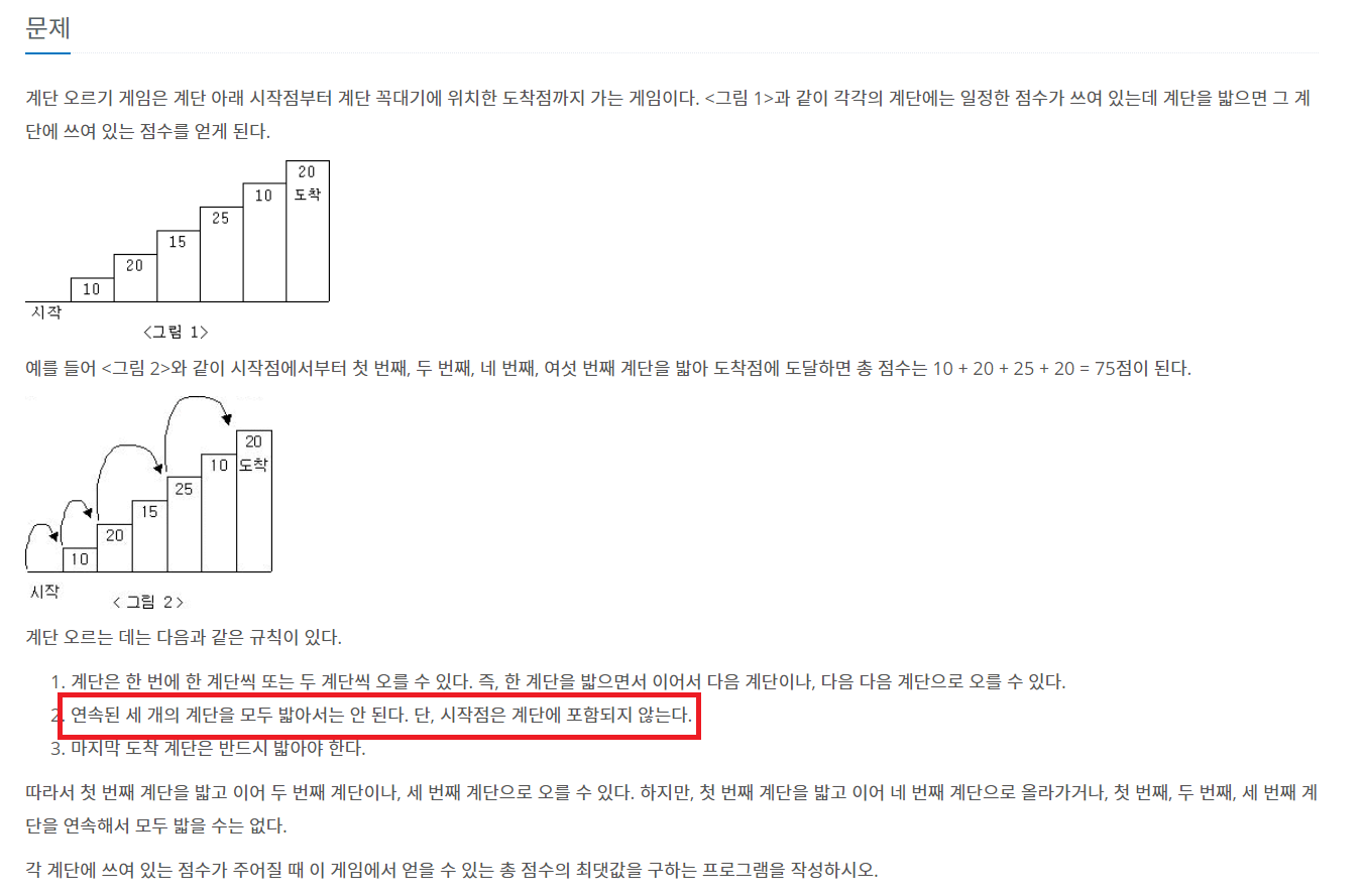 계단 오르기 게임은 계단 아래 시작점부터 계단 꼭대기에 위치한 도착점까지 가는 게임이다. <그림 1>과 같이 각각의 계단에는 일정한 점수가 쓰여 있는데 계단을 밟으면 그 계단에 쓰여 있는 점