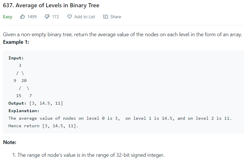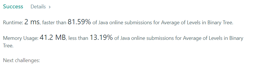 LinkedList를 통해 bfs로 해결이 가능하다. 처음 root를 추가하고, 이후에 추가되는 queue의 갯수에 따라서 size가 정해진다. 다시 while문을 내부에 돌려 size만큼 있는 val들을 더해주고 size로 나눠준다.