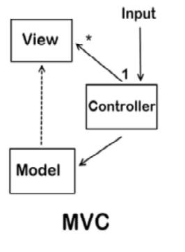 Controller에 Input이 들어온다. View와 Controller는 MVC 구조에서 설계의 상단에 위치한다. Model은 그 아래 위치하며, 따라서 View는 Controller에 대해 알고 있고 Controller는 Model에 대해 알고 있다. View는 Model에 직접 접근이 가능하다.