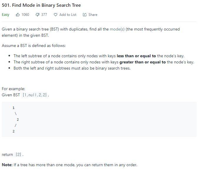 이진탐색 트리라는 것을 친절하게 설명하고 있습니다. 그것보다도, 중복된 요소를 찾고 list로 반환하는 것이 더 중요해보입니다. Integer만을 다루는 Map의 형태이며 중복을 찾아야 하기 때문에 모든 요소 값에 따라서 등장할 때마다 +1씩 하도록 했습니다. 그리고 처음부터 순회하면서 value값이 최대로 큰 경우를 고르고 key값을 list에 넣어서 반환합니다.