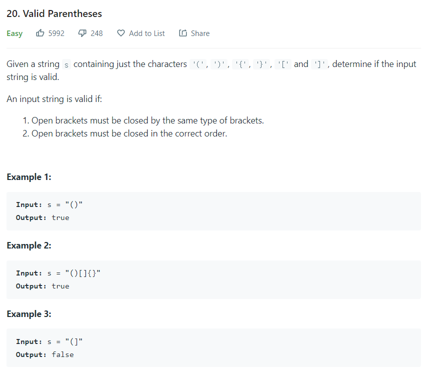 마찬가지로 괄호는 stack에 관한 문제입니다. 단, 이 문제에서는 괄호 모양이 3개가 있습니다. 이 괄호모양이 유효한지 확인해야 합니다. 정상적인 괄호라면, ')' '}' ']'가 나올 때 stack.peek()이 해당 괄호와 맞는 모양이어야 한다는 것입니다. 따라서 그것을 체크해주면서 하나씩 풀이하면, O(N)에 확인이 가능합니다.