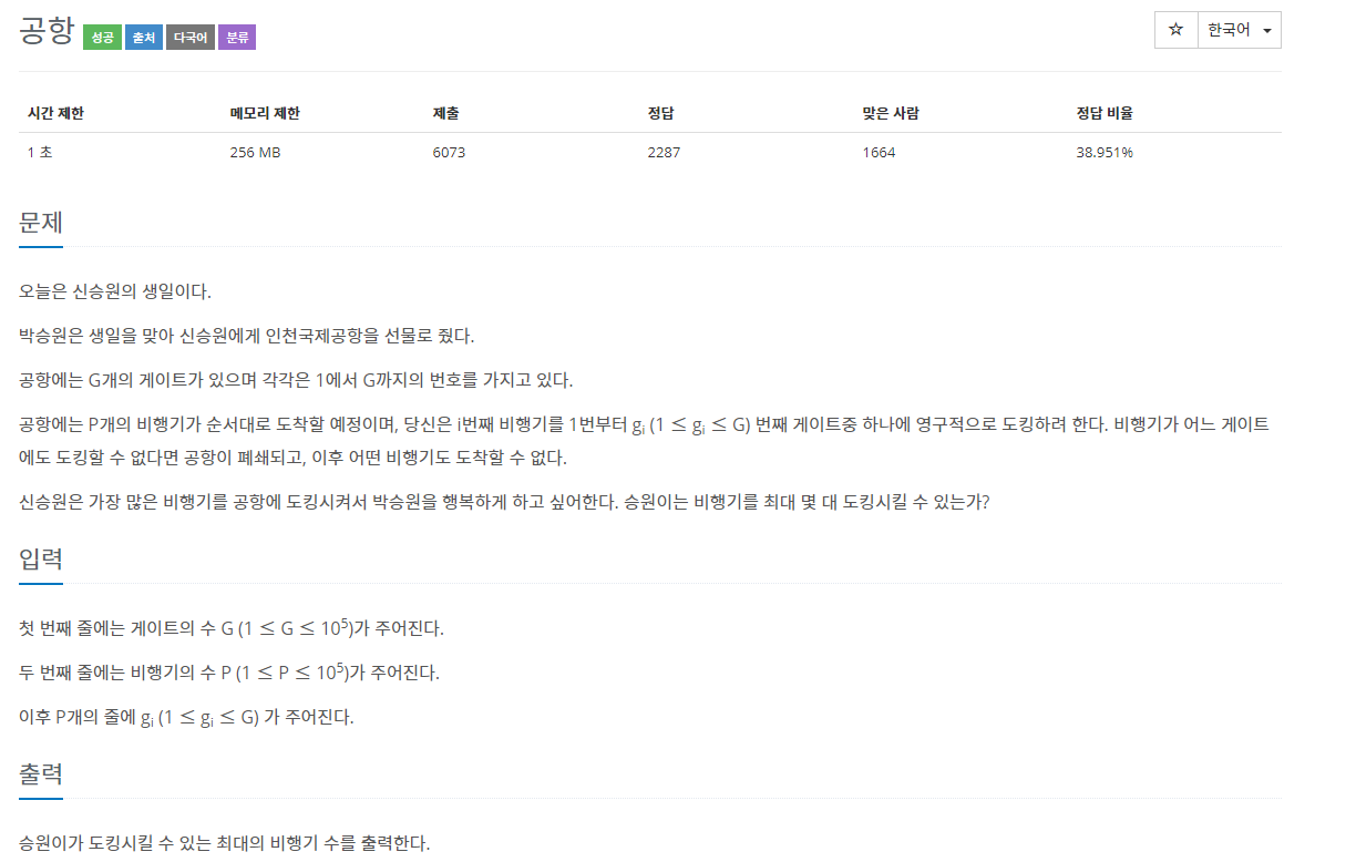union과 find에서 어떠한 연산을 해주어야 하나? union에서는 부모를 찾은 후, 부모보다 1 작은 값은 부모로 넣는다. 이것은 최대한 큰 게이트 번호에 비행기를 넣겠다는 의미이다. 그리고, 그 전에 find로 검사해, 부모의 값이 0인지 검사해야 한다. 0이라는 의미는 더이상 비행이가 들어갈 공간이 없다는 것을 의미한다. 따라서 0인 순간 그만 두어야 한다.