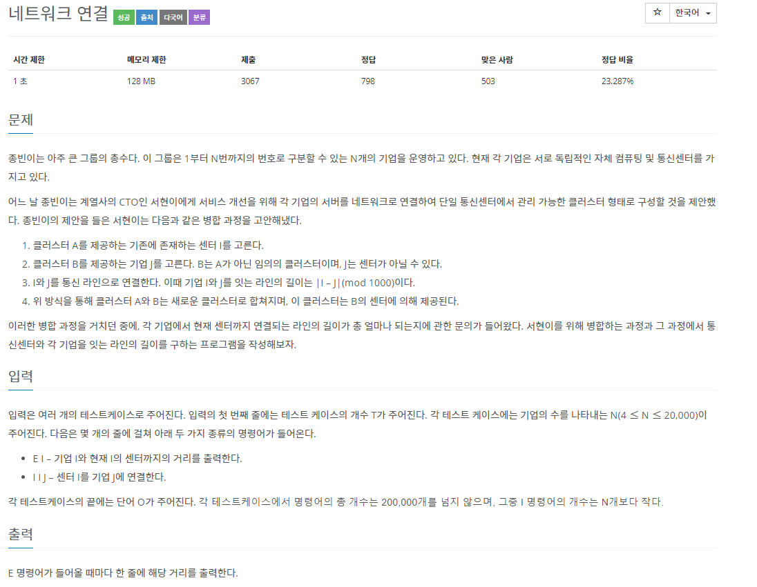 Union-Find를 통해서 해결이 가능하다. 처음에 문제를 이해하는데 오래 걸렸다. 이 문제의 특징은 단순히 union으로 관계를 설정하고, find를 통해서 관계를 발견하는 것이 끝이 아니다. 거리가 존재하기 때문에, 이를 계속 업데이트 해주어야 한다. 따라서 parent 배열 이외에도 dis 배열을 하나 만들어서 계속 거리 값을 최신화했다.