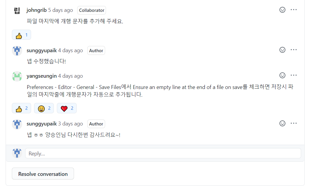 사소해보이지만 반대로 귀찮을 수 있는것을 친절하게 알려주셔서 감사합니다. 저도 제가 알고 있는 부분을 다른사람들에게 나눌 수 있는 기회들을 잘 활용하겠다고 생각하는 계기가 됩니다 ㅎㅎ