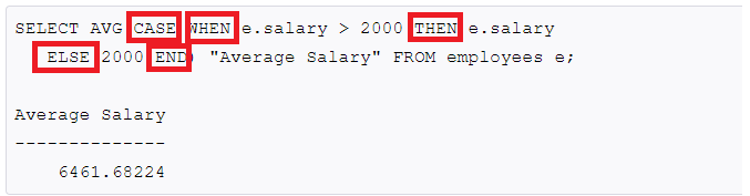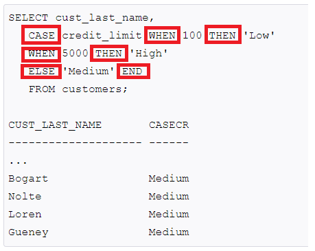 첫번째의 경우는 CASE WHEN THEN으로 해결이 가능합니다. 그런데 해당 기능을 쓰면 결과적으로 "단순히 값"만 표현할 수 있습니다. ORACLE 공식문서 예시에서 SELECT절에 CASE WHEN THEN을 사용하는 예제가 있습니다. 아래 SELECT하는 칼럼을 먼저 살펴보고, 이후 WHERE에서 사용법을 살펴보겠습니다.
