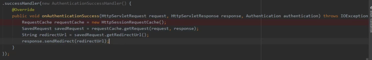 또한 로그인을 성공하고나서 이전페이지로 돌아갈 수 있습니다. 그렇기위해 로그인페이지로 들어왔을 때, referrrer 헤더에 이전 페이지 주소에 대한 정보를 기억하도록 하거나 RequestCache와 SavedRequest를 통해 이전 페이지에대한 정보를 저장하고 리턴할 수 있습니다. 강의에서 선택한 후자 방법은 아래 사진과 같으며 시큐리티 설정에서 성공핸들러를 만들어두면 별도의 설정없이도 이용이 가능합니다.