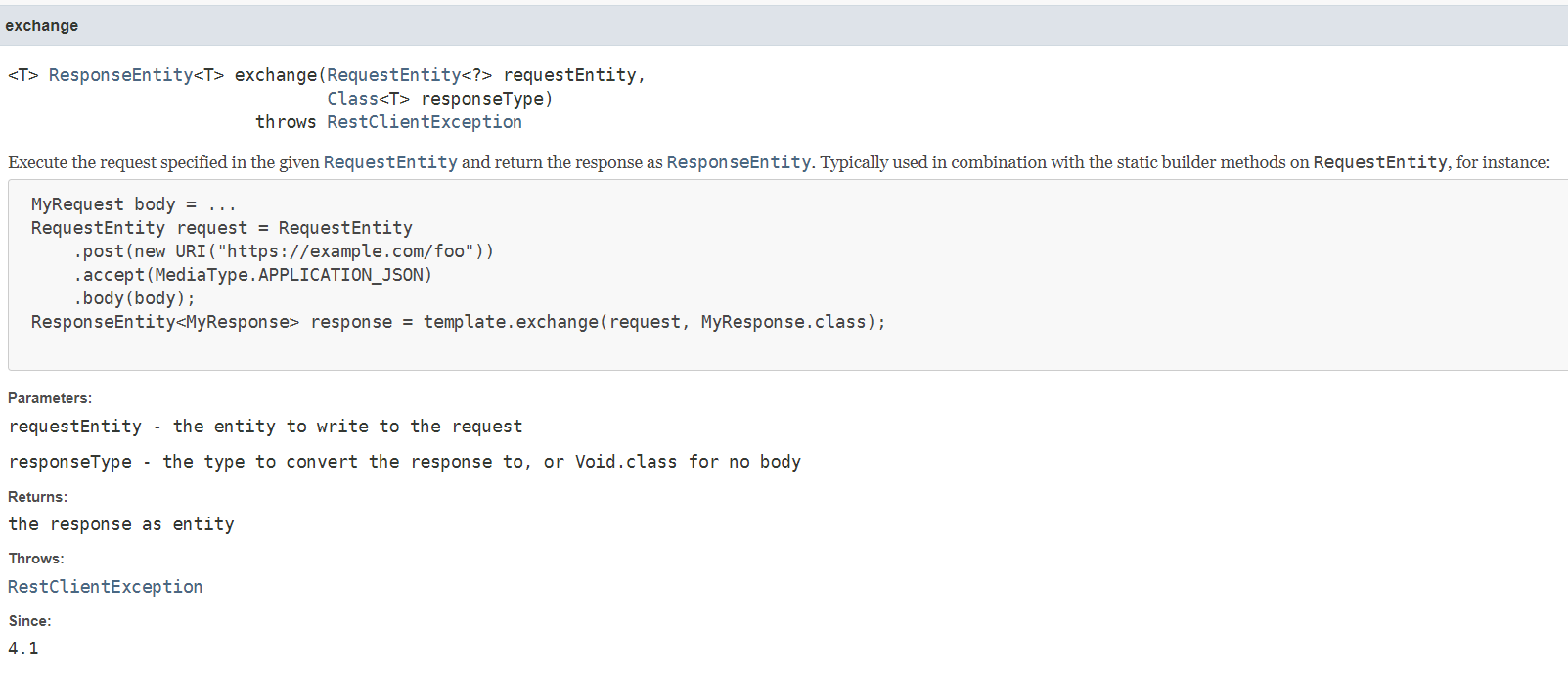 RestTemplate의 대표적인 exchange, execute 이외에 postForEntiy와 PostForObject 메서드가 있다. postForEntity()는 ResponseEntity 객체를 리턴받는 다는 것이 차이점이고 기능은 같다.