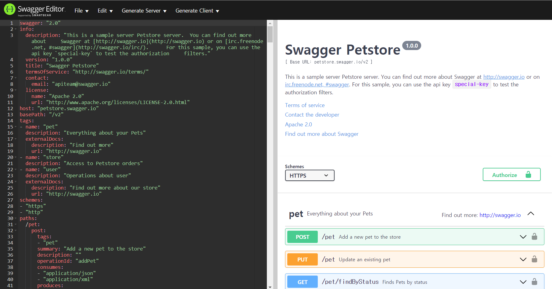 - Swagger Editor - 브라우저 기반 에디터로 Open API 명세를 작성한다.