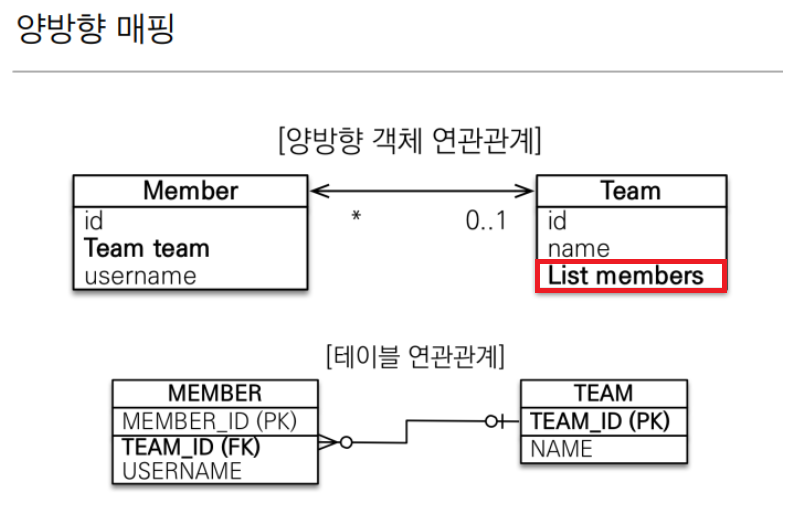 => 테이블 연관관계의 경우 FK를 가지고 있으면 FK를 이용해서 테이블을 자유롭게 조회 할 수 있지만, 객체 연관관계에서는 본인 엔티티에 반대 테이블 정보를 가지지 않으면 조회가 불가능합니다. 따라서, FK가 없는 곳에서는 반대 엔티티를 "조회"할 수 있도록 List를 만들어줍니다.