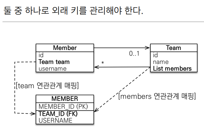 결론은 외래키를 가지고 있는 쪽이 외래키를 "관리"하는 주인이 됩니다. (Member, Team 중에서 Member)