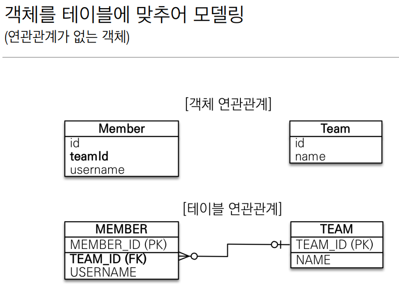 테이블은 외래 키인 TEAM_ID(FK)로 조인을 사용해서 연관된 테이블을 찾습니다. 전통적으로 테이블 관계에서 다른 테이블을 찾을 때 사용하는 방법입니다. 대부분 쿼리문을 작성할 때는 다른 테이블의 FK를 참조합니다.