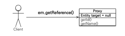 em.getReference()로 Proxy를 호출하면, 처음에는 Entity target = null; 입니다. 영속성 컨텍스트에 해당 엔티티가 없어도 실제 DB에 쿼리문을 날리지 않고 null을 가져옵니다. (이후 해당 객체의 칼럼을 조회할 때 쿼리가 나갑니다.)