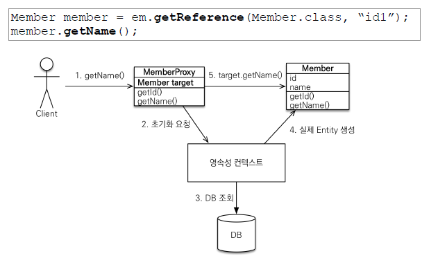 *em.getReference()로 같은 Member 객체 == 비교(true)