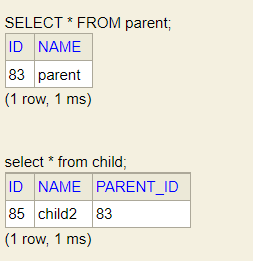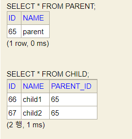 addChild()로 부모설정을 했기 때문에 CHILD 테이블의 2개 데이터는 PARENT_ID가 모두 65입니다.