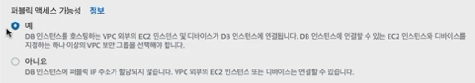 [DB 인스턴스 수정]으로 수정을 할 수 있다. 퍼블릭 엑세스 가능성을 "예"를 선택해서 외부에서 DB에 접근할 수 있도록 설정해야 한다.