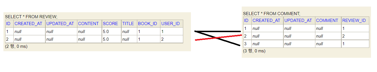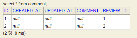 Comment 테이블에는 2개의 row가 저장되어 있습니다.