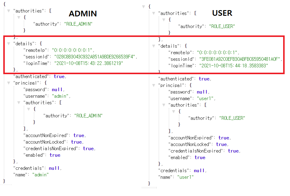 두번째로, AuthenticationDetailsSource의 buildDetails메서드를 구현한다. 여기서 RequestInfo로 ip, 세션, 로그인 시간을 전달한다. HttpServletRequest로 확인 가능한 정보들을 서비스에서 호출하지 않고 필터에서 미리 가지고 있기 위해서다. 이 데이터들을 detail이라고 하고, 로그인 시에 리턴하도록 한다.