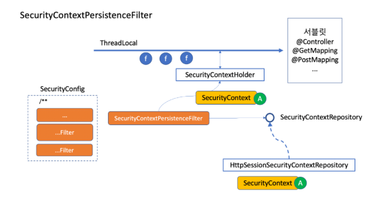 SecurityContextPersistenceFilter는 이름에서 알다시피 SecurityContext를 영속화하는 책임을 가진다. 영속화는 SecurityContextRepository라는 저장소에서 이루어진다. 또한 한번 로그인을 하고나면, 이후에는 세션에 저장된 SecurityContext을 가져다가 SecurityContextHolder에 넣어주어 전반적인 요청에 SecurityContext를 사용할 수 있도록 해준다. SecurityContextRepository 저장소는 HttpSessionContextSecurityHolder를 저장한다. 작업이 끝나면 SecurityContextHolder를 clear해주기 떄문에 ThreadLocal에서만 안전하도록 보장을 해준다.