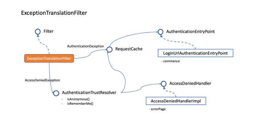 ExceptionTranslaterFilter는 FilterSecurityInterceptor에서 발생한 오류들을 가로채서 처리한다. AuthenticationException과 AccessDeniedException 2개에 해당한다. 그 이외의 오류는 ControllerAdvice를 통해서 해결한다. ( ExceptionTranslaterFilter는 제공하는 기능이 많기 때문에 커스터마이징을 하지 않는 것을 권장한다. )