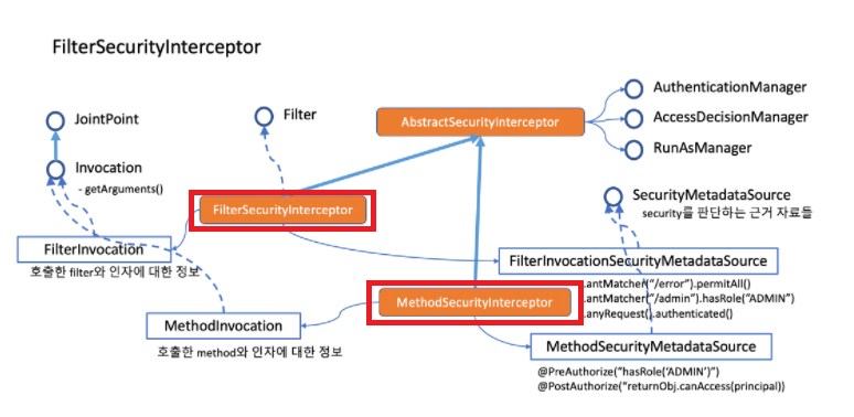 Interceptor 권한검사는 2곳에서 가능하다. FilterSecurityInterceptor 혹은 MethodSecurityInterceptor 이며 각각 필터, 메서드에서 검사한다. 해당 검사기능들이 Filter에 있는지 Method에 있는지에 따라서 작동하는 시점이 달라지는 것이다. 2가지 Interceptor의 역할과 차이점을 알아본다.