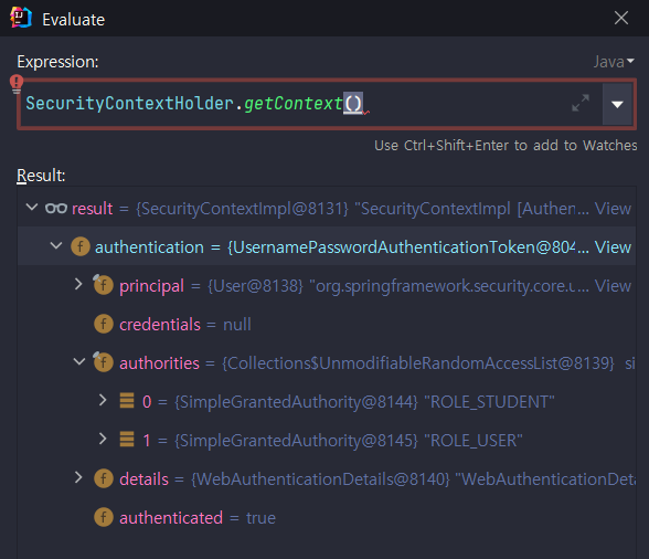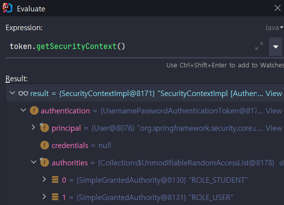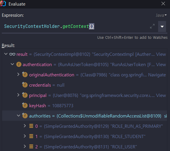 RunAs를 통과하기 이전에는 ROLE_STUDENT, ROLE_USER를 가진다.