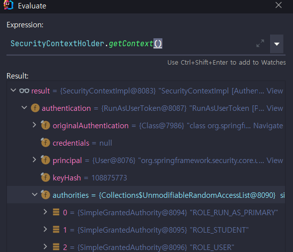 RunAs를 통과하기 이전에는 ROLE_STUDENT, ROLE_USER를 가진다.