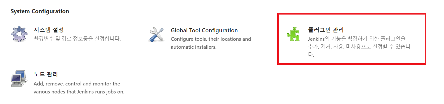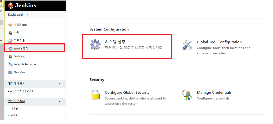 공개키를 jenkins에 저장하기 위해 [Jenkins 관리] - [시스템 설정] 으로 이동합니다.