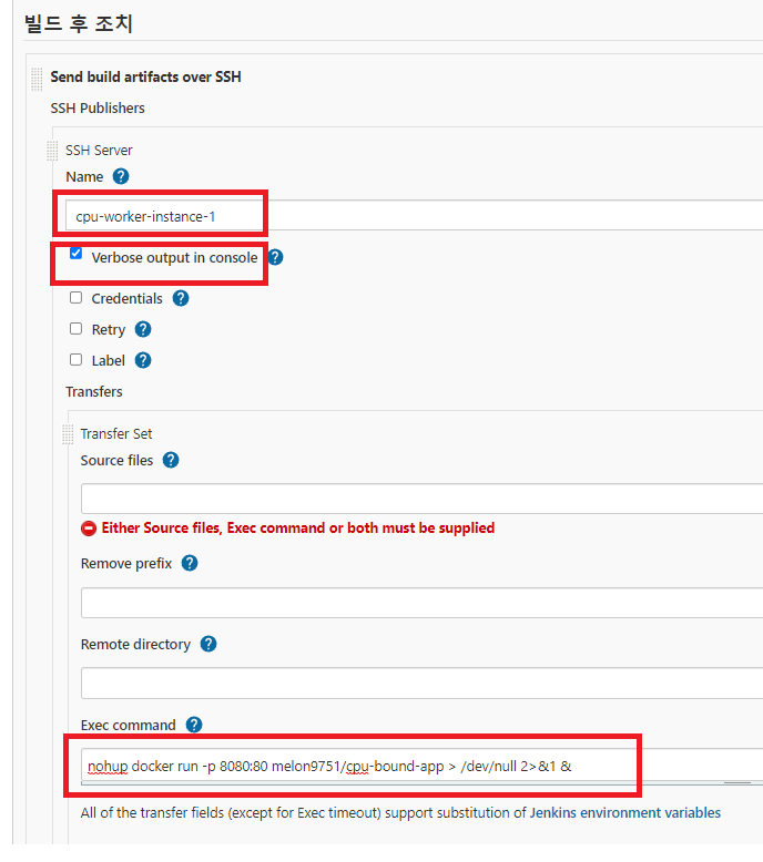 [빌드 후 조치]에서 [Send build artifacts over SSH]을 추가합니다