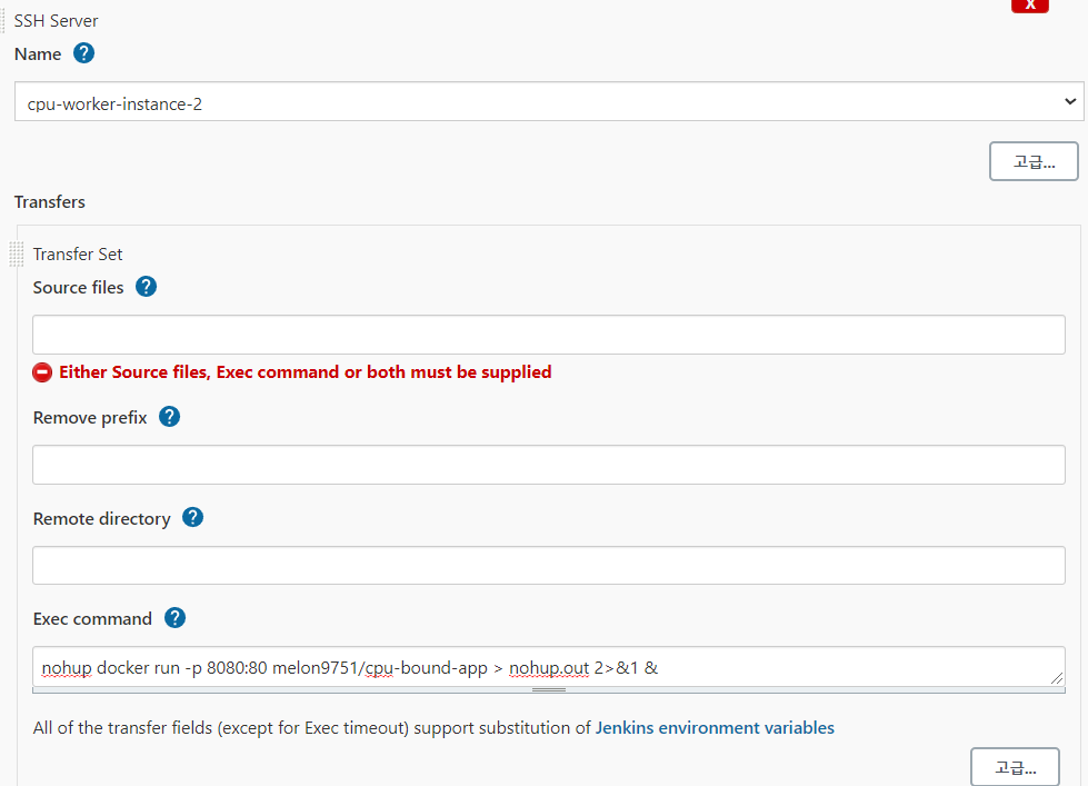 [Jenkins 관리] - [시스템 설정] - [Publish over SSH]에서 새로 생성한 instnace 2개를 추가합니다. 이전에 추가했던 내용과 똑같이 적용합니다.