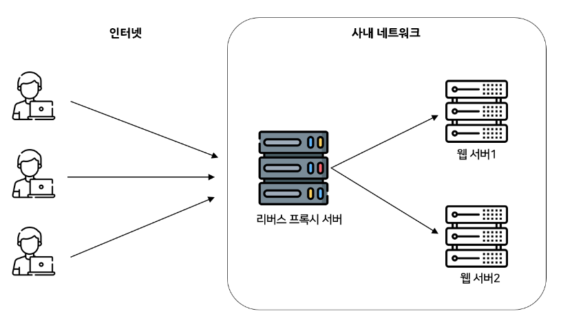 리버스 프록시는 여러개의 서버 앞에 웹서버에 존재하여 로드밸런싱 역할을 합니다. 따라서 수많은 요청에도 과부하 걸리지 않도록 부하를 낮춥니다. 로드밸런싱 뿐만 아니라 보안에 좋습니다. 리버스 프록시를 사용하면 보래 서버의 IP주소를 노출시킬 필요 없이 해당 서버를 통해서 알고리즘에 따라 서버에 요청이 전달됩니다.