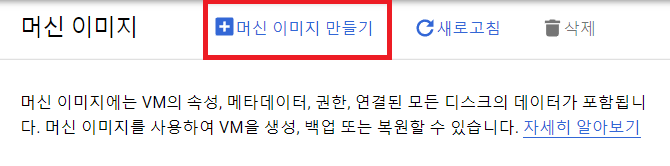 만약에 저장된 머신 이미지가 없다면 다음과 같이 기존에 존재하는 인스턴스를 이미지로 만들 수 있습니다.