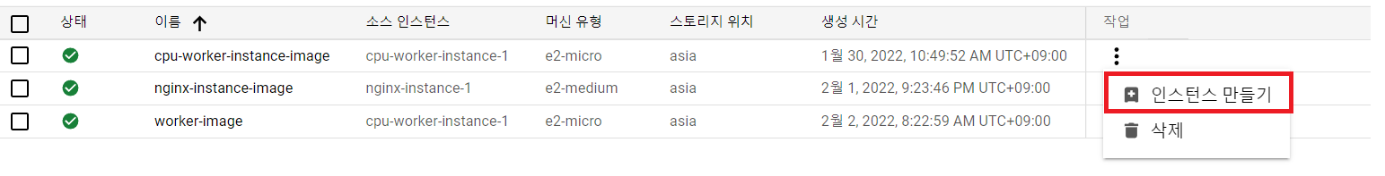 머신 이미지에 들어가면, 맨 오른쪽 작업에 [인스턴스 만들기]를 통해 새롭게 만들어주면 됩니다.
