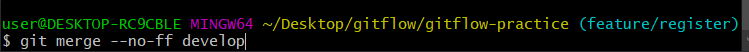 열심히 회원가입을 만들고 있던 개발자는 login 구현이 끝나서 feature finish가 되었다는 소식을 들었습니다. develop은 자동으로 merge를 안내하지만, 다른 feature들은 해당 내용을 알지 못합니다. 따라서, 작업도중에 register 기능을 만들고 있던 개발자는 수동으로 최신 develop을 merge합니다.