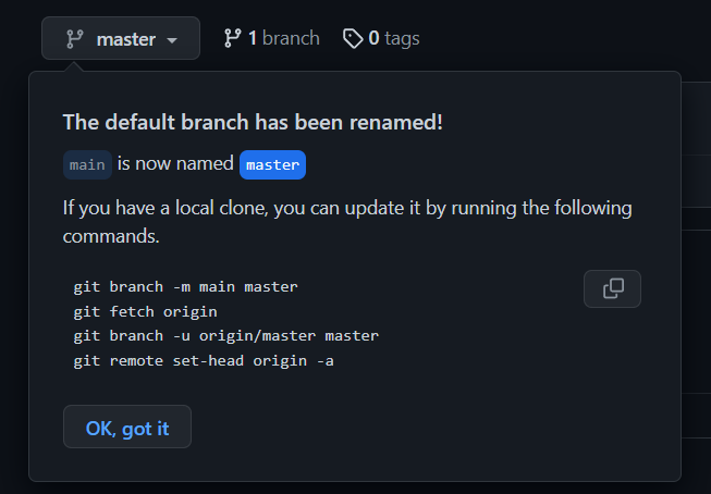 github repository에서 git의 default branch인 main을 master로 변경합니다. 이 때, github에서 친절하게 local repository에서 default branch를 변경하는 방법을 제공합니다. ( 그냥 main으로 해도 무방합니다 )