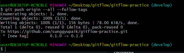 이제 local repository에만 반영된 사항을 origin repository에도 push합니다. 이 때 새로운 태그버전이 생성되었으므로 태그버전도 같이 push하는 것을 잊지 않습니다.