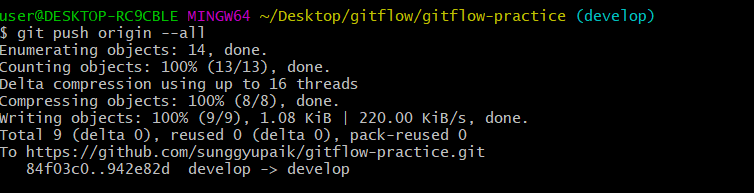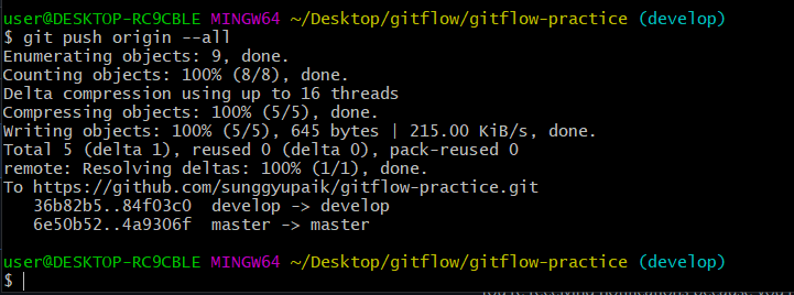 git flow 시작에 따라서, master와 develop branch만 존재합니다. 이는 local repository에만 생성되었기 때문에, origin repository에 develop branch를 등록하기 위해서 push 합니다.